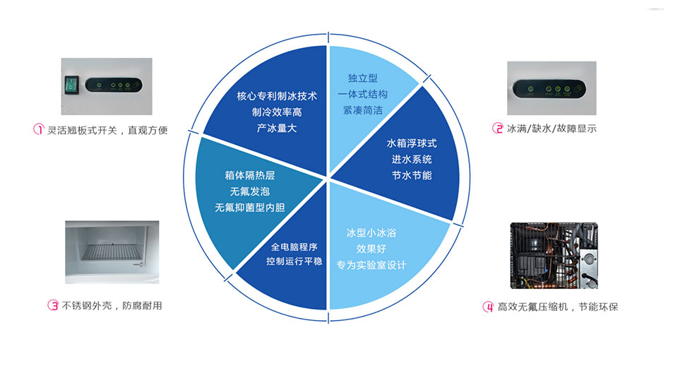 10)所制冰形为不定形的细小颗粒状雪花碎冰,冰形小,能渗入较窄间隙,冷却速度快,冰浴好,为实验室设计。